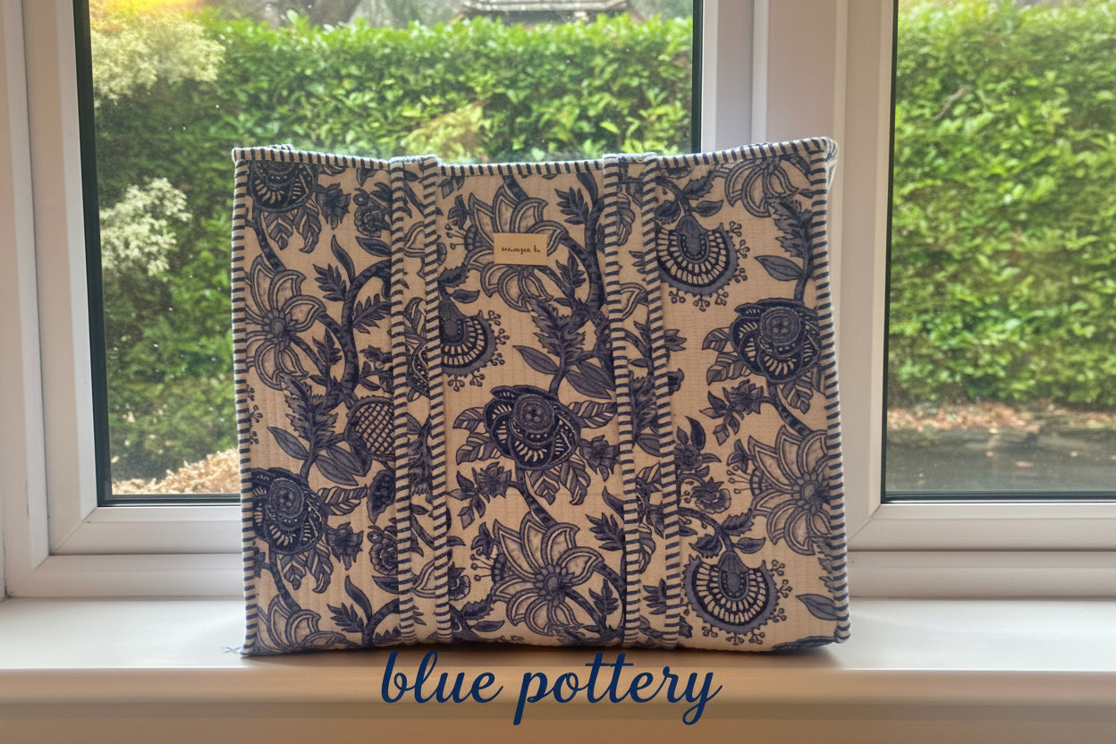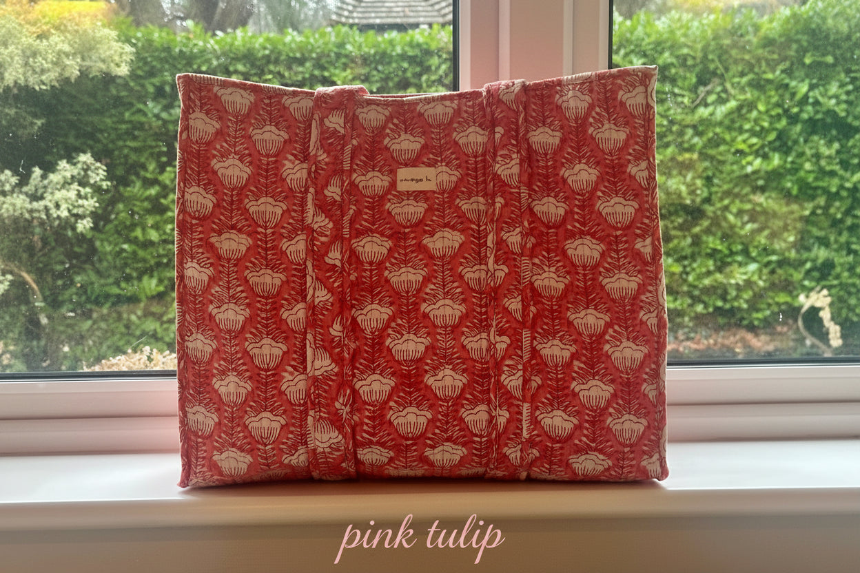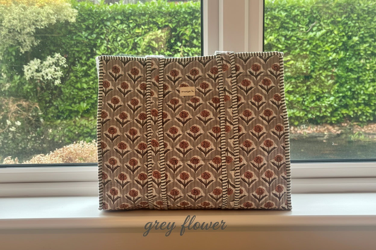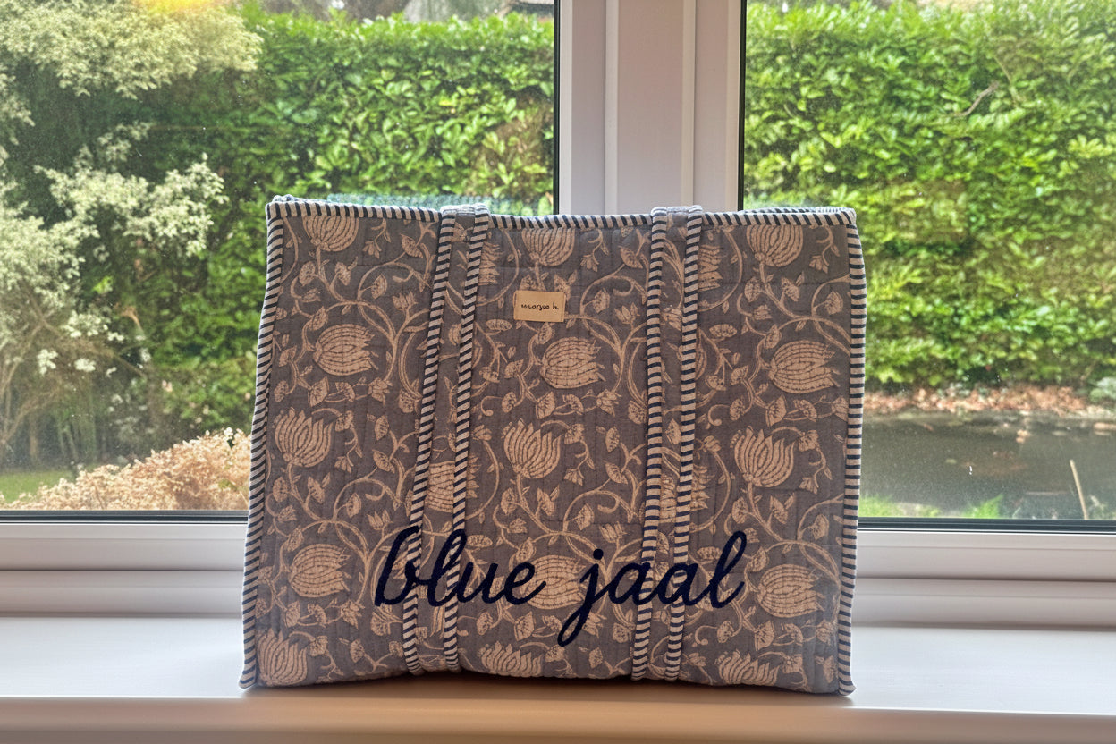 New for 2026, these hand printed totes have been produced in Jaipur and are made from beautifully soft, quilted 100% cotton. Colour palette of soft hues in blue, grey and pinks complimented by contract striped piping.